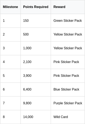 Dưới đây, tìm thấy một cái nhìn tổng quan đầy đủ về tất cả các cột mốc và phần thưởng đầy sticker tương ứng của chúng, được trình bày trên hai trang.